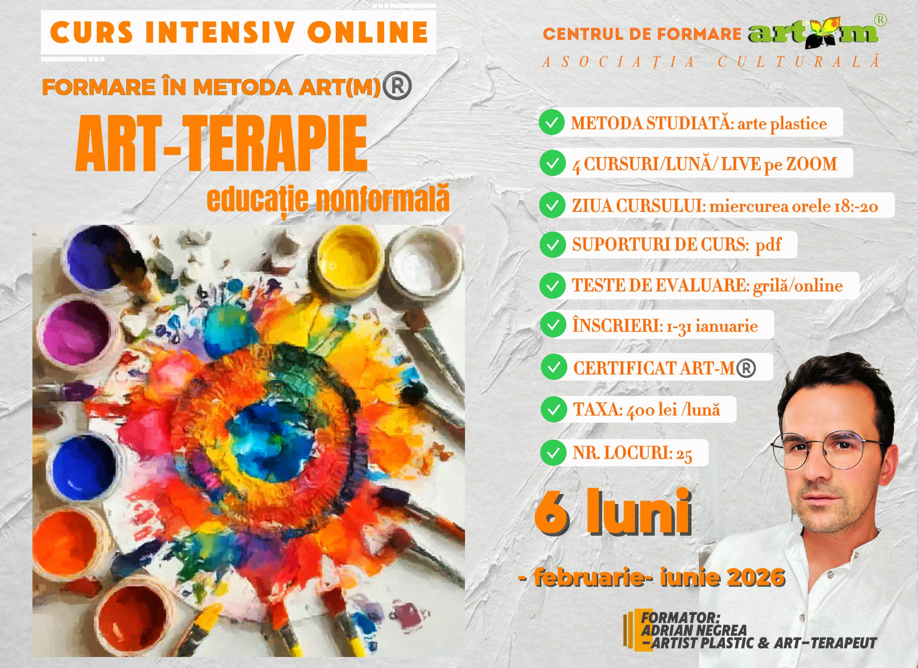 CURS DE DEZVOLTARE PERSONALĂ PRIN ARTĂ /online 300,00 lei Stoc epuizat Categorie: Fără categorie Produse similare Curs de picătură „Stilul Van GOGH”/ online 300,00 lei Adaugă în coș CURS- GEOMETRIA SACRĂ 400,00 lei Citește mai mult RETREAT IN TEHNICI DE ART-TERAPIE 18-21 iunie 2026, BREB-MARAMUREȘ 1.800,00 lei Adaugă în coș CURS DE PICTURĂ pentru copii (7-13 ani) BAIA MARE 400,00 lei Adaugă în coș Navigare în articole Previous: CURS DE PICTURĂ pentru adulți, BAIA MARE(aprilie 2026)Next: 4 ATELIERE DE EXPRIMAREA EMOȚIILOR PRIN ARTĂ/ grup de suport oncologic